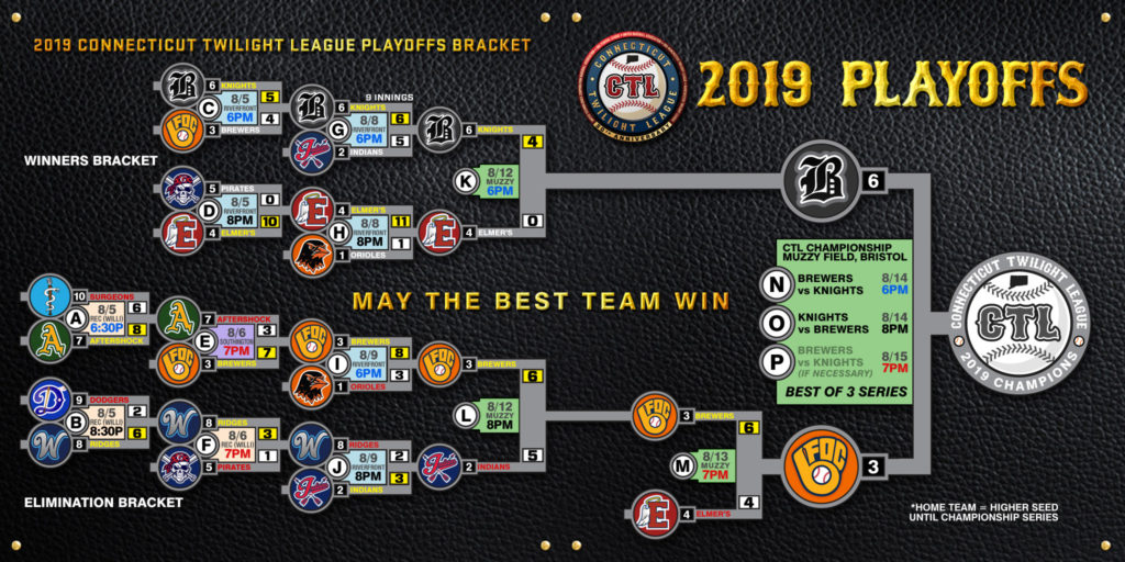 2019 CTL Championship Series starts (and possibly finishes) tonight at the gorgeous Muzzy Field in Bristol Connecticut! Game 1 starts at 6pm…with the elimination bracket champ #3 seed Fat Orange Cat Brew Co. Brewers taking on winner bracket champ and #6 seed Bristol Knights . In the 8pm game, the teams flip home and away and try again. If the two teams split, we play the if necessary and winner take all game 3 tomorrow (THU 8/15) at Muzzy Field. Good Luck to both teams #baseball #playoffs#connecticut #ctbase #CTLBaseball #connecticuttwilightleague#twilightleague #twilightbaseball